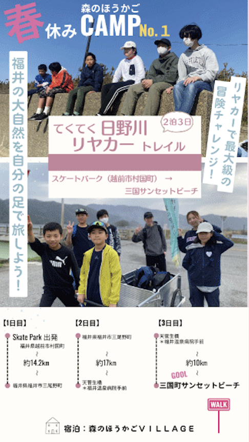 みんなでリヤカーをひいて越前市から三国の海を目指す大冒険。笑ったり泣いたりとたくさんのドラマと成長がある3日間!